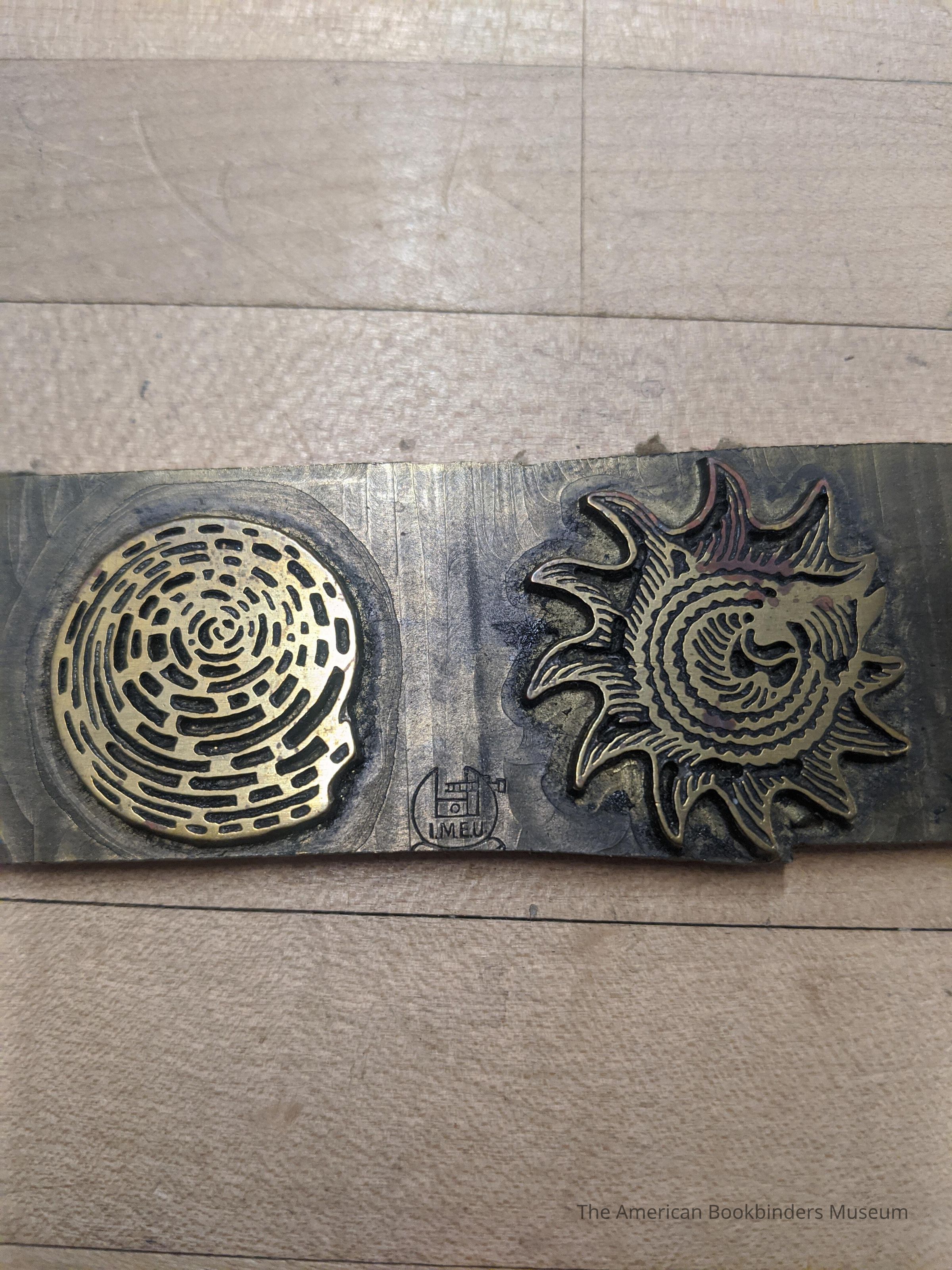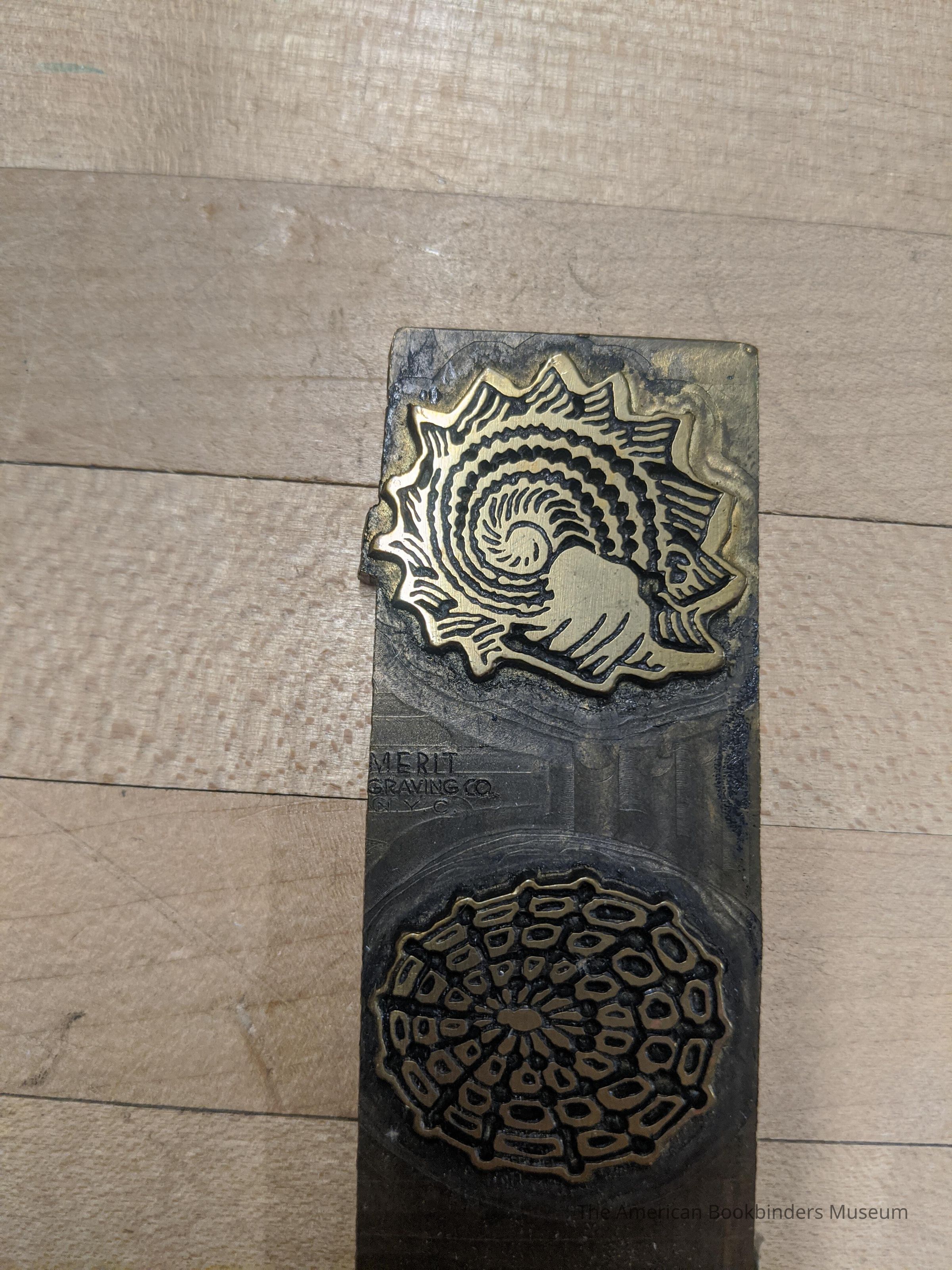 Band die with 5 different sea shells engraved along its length. This die has two small marks engraved on the negative space: "Merit graving co." and a vise with "I.M.E.U" on the base.