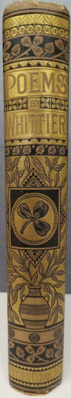 Bound in light brown beveled cloth with black and gilt stamping of intricate borders of flowers, leaves, repeat patterns, and classical urn. Eastlake elements. Spine features a classical urn and a three leaf clover. Publisher's name in gilt to the bottom of spine reads "Belford, Clarke and Co. All edges gilt. Tan floral endpapers.