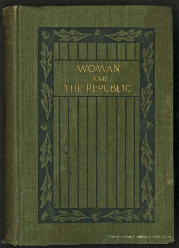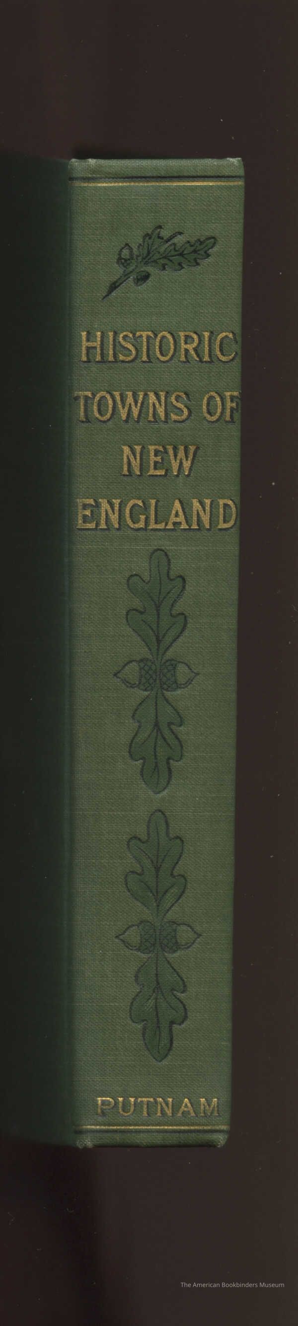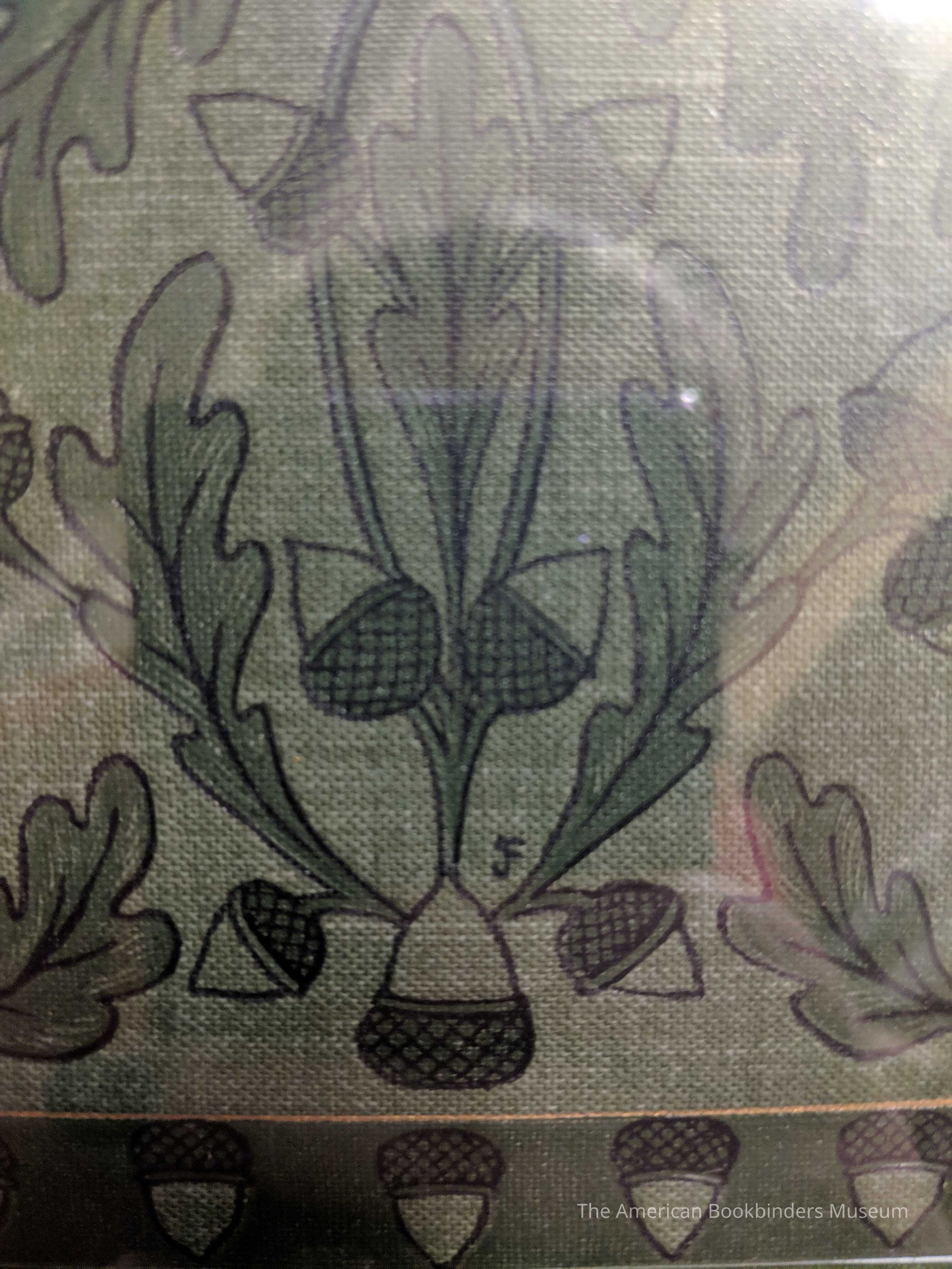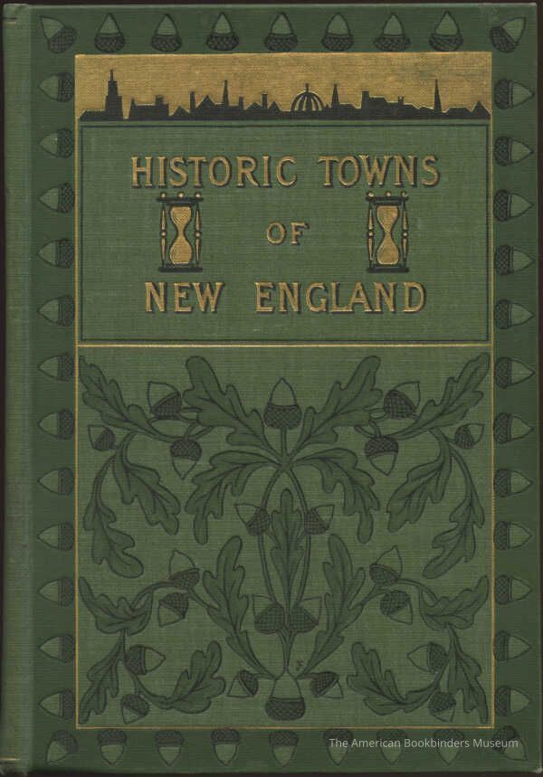 Bound in dark green cloth with stamping in gilt, black, and dark green. Titles to front and spine outlined in black. Acorn and leaf art nouveau design within a gilt frame. Acorn border. Gilt silhouette design of town to top. Motif repeated to spine. Unidentified SIGNED binding "JF." Top edge gilt.