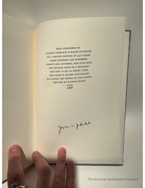 Sylvester and Orphanos, 1985. First Edition. Hardcover. Signed Lettered Edition. 76 pp, colophon. 14 color photos inlaid. 8vo, grey cloth with gilt stamped covers in floral pattern, gilt slipcase. Signed on the limitation page and lettered, edition limited to 330 copies (300 numbered, 26 lettered, 4 named). Letterpress printed by Patrick Reagh in Bembo type on Arches Mouldmade paper. The color plates were never inlaid on the majority of the backstock copies and many of these have trickled out in the trade without them. A series of eleven essays on art. 'Compared to writing, pictorial and sculptural art are holy, unproblematical, and resolute; we are invariably better for time spent in their contemplation' - from Updike's foreword. This is number 107 of 330
