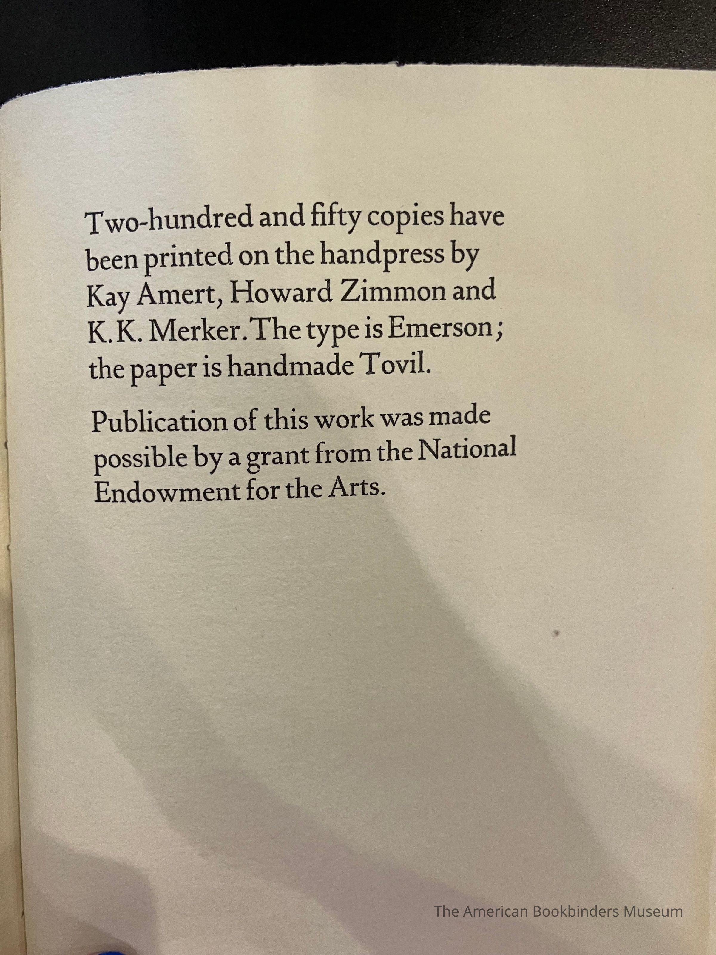 Published by The Stone Wall Press and the Seamark Press. Colophon at back - 250 copies printed on the hand press by Kay Amert, Howard Zimmon and K. K. Market. Emerson type, paper is handmade Tovil. Publication made possibly by a grant from the National Endowment for the Arts.