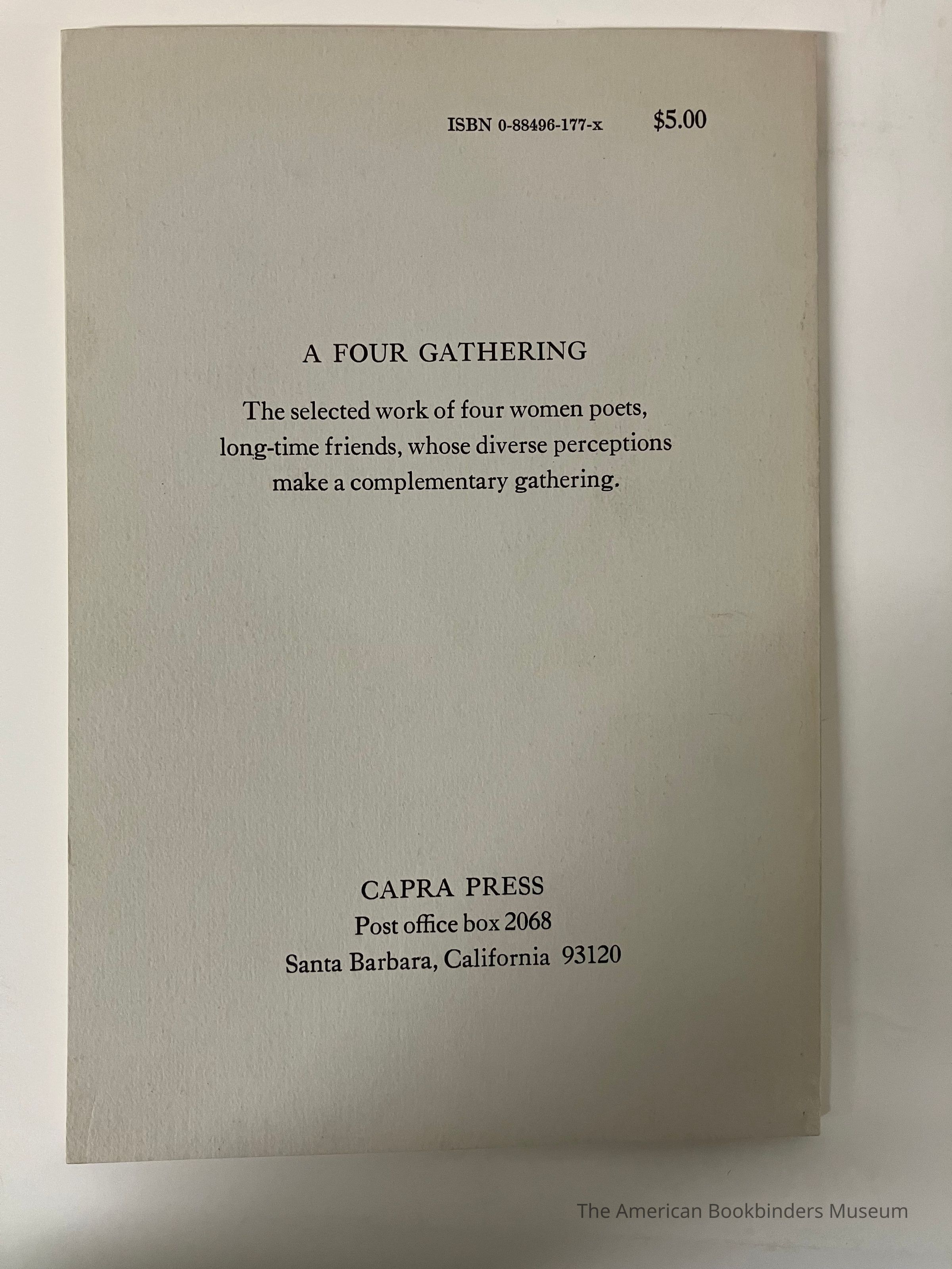 “The selected work of four women poets, long-time friends, whose diverse perceptions make a complementary gathering.”