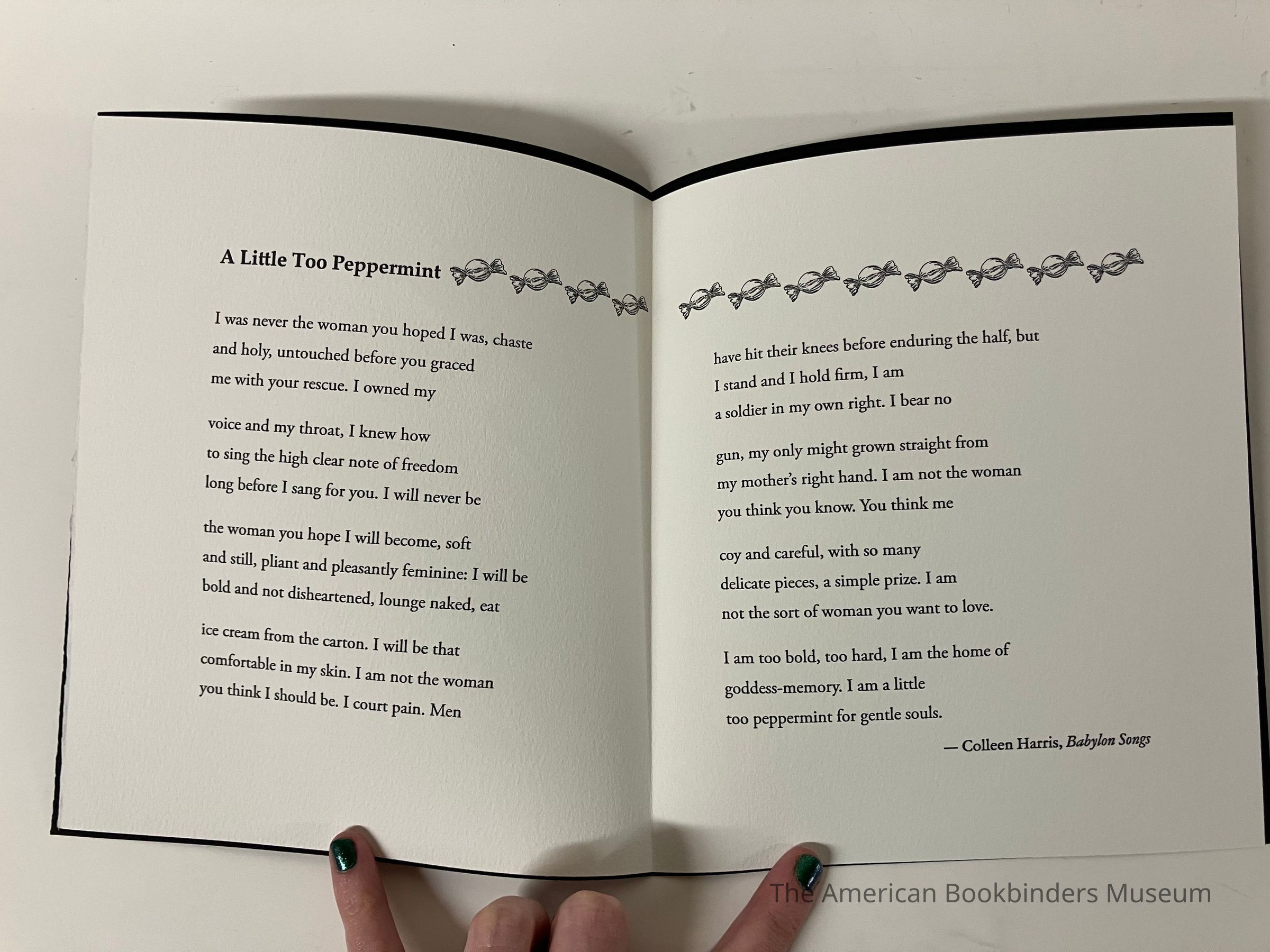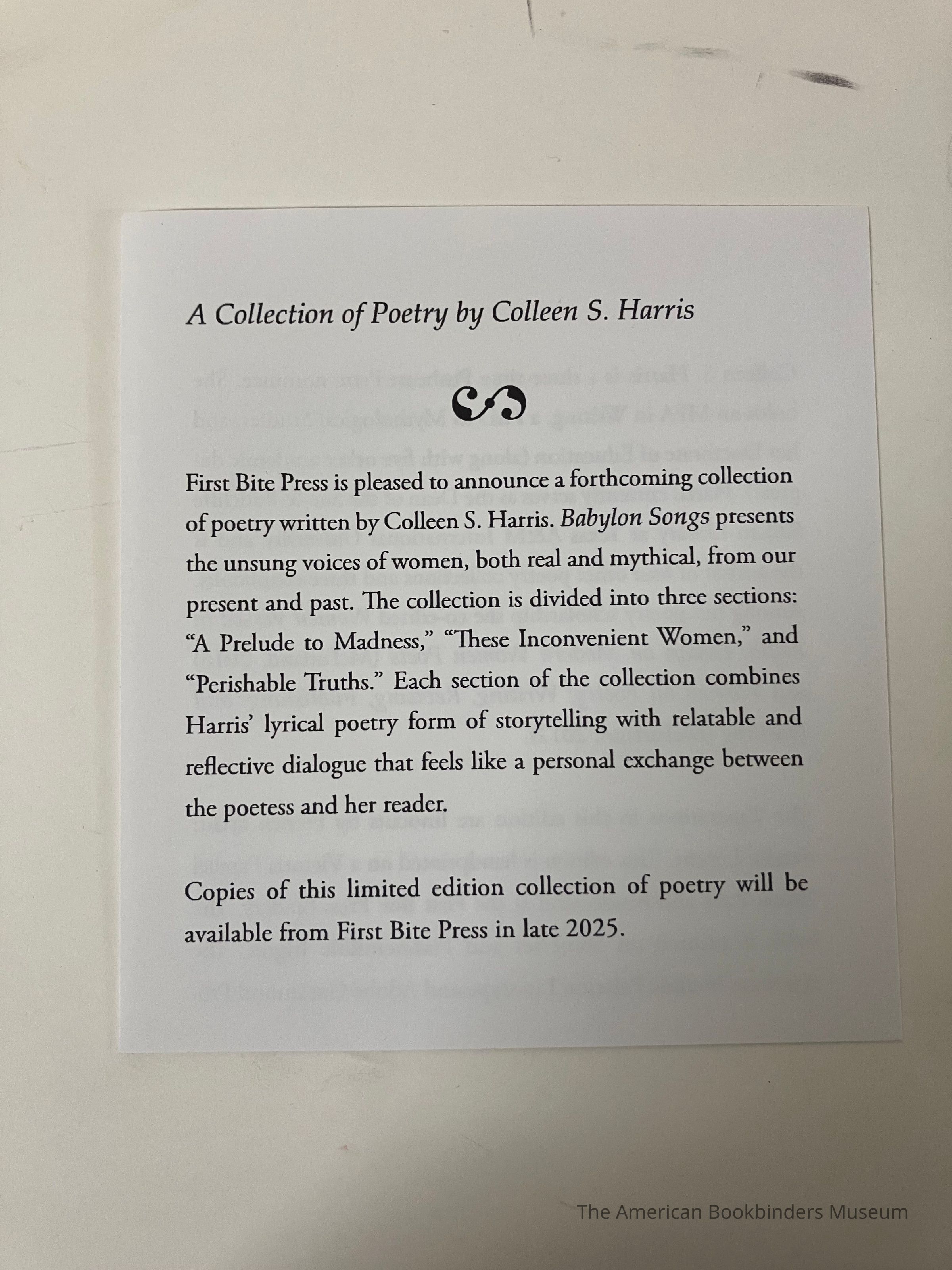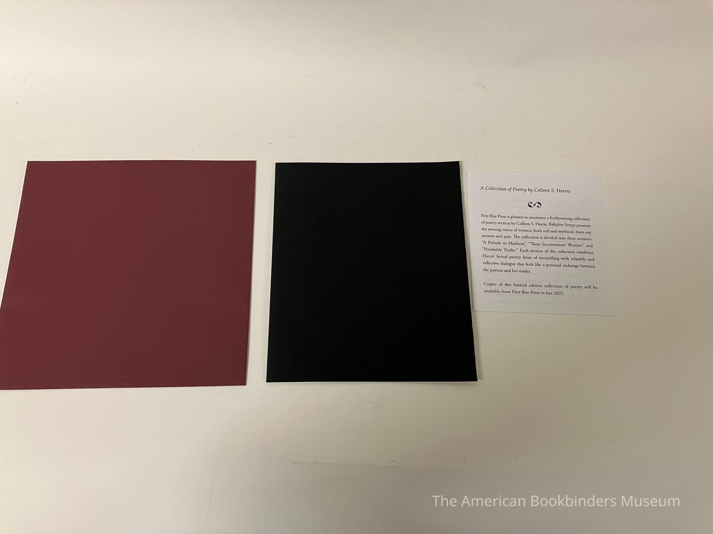 Excerpt of upcoming book "Babylon Songs".Held in a burgundy envelope. Book itself is a set of folios folded into a black paper cover, also a folio. Has a an announcement of upcoming publications from First Bite Press