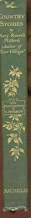 All edges gilt. Dark green cloth with elaborate gilt design to spine and cover. Front design shows man on ladder picking fruit from a tree while a woman stands below catching the fruit in her apron and a child kneels on the ground gathering the fallen fruit. This is within a plaque-like border with four hares at the bottom. Illustrations by George Morrow. Black stone endpapers. Cover design is in the style of the Hugh Thomson Cranford Series.