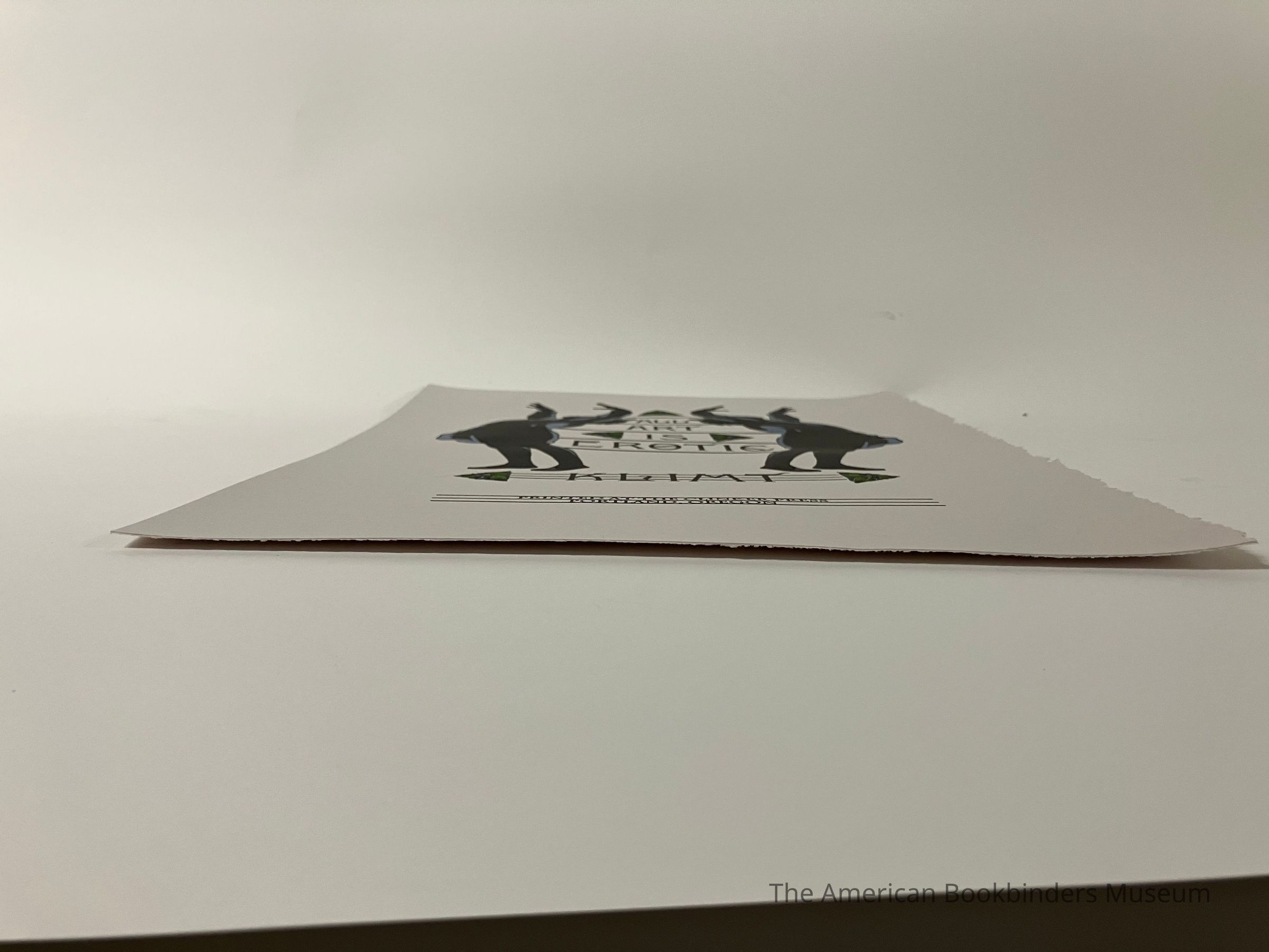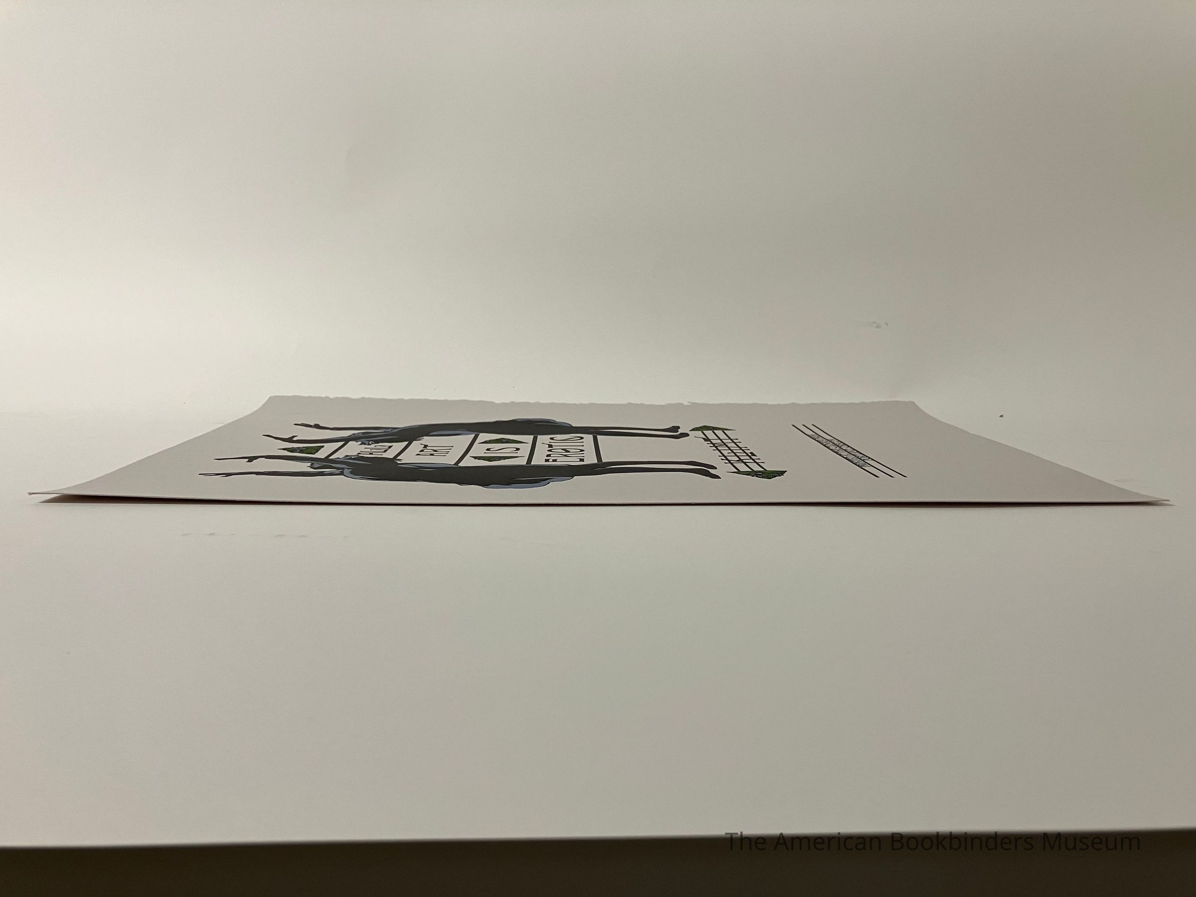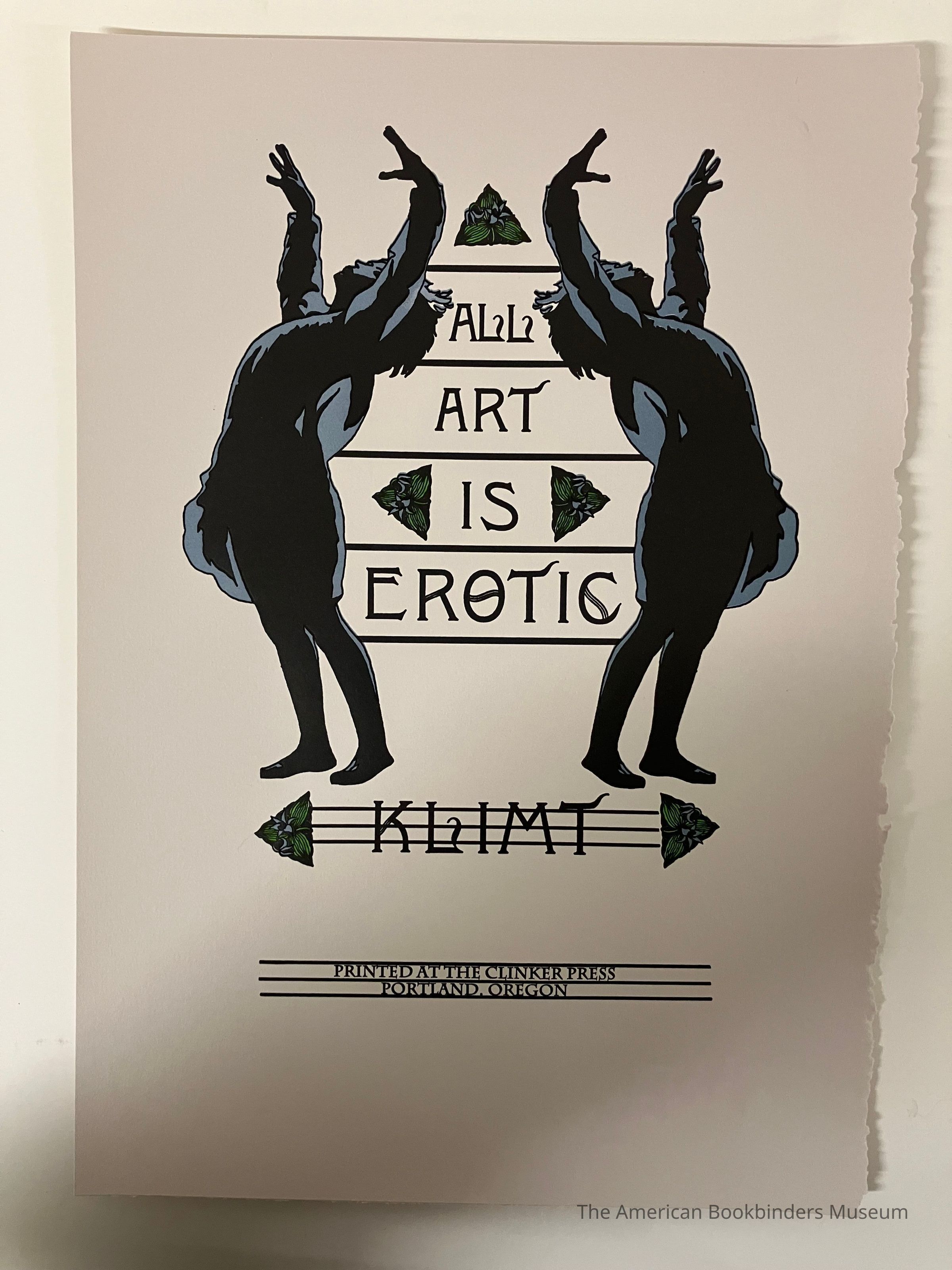 Right and left sides have figures leaning back while looking up, arms outstretched. Text between them, with each work on a separate line. Interspersed is a triangular floral design of three leaves and a blue flower. Author's name below the figures. Farther down is printing information. Right edge is raw, while the bottom edge is torn.