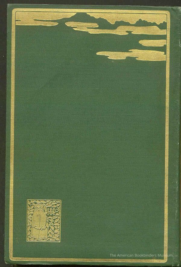 Bound in flexible green diagonal-fine-rib-grain cloth in a wrap-around design, an unsigned binding by Bertha Stuart. (Stuart designed the companion volume). Black and white photographic scenic endpapers. All edges gilt. Design is a scene of tall Pacific Northwest evergreens growing against a backdrop of snow-covered mountains and hanging clouds. Title is within a framed center rectangle with a motif of elongated clouds. This motif is carried over the spine and onto the top of the entire rear cover, where a group of clouds hang before the treeline. The entire design is created using only bright and matte gilt. The overall effect of the design is very Asian inspired. The right left corner, also in gilt, has the Henry Holt monogram with owl (very unusual).