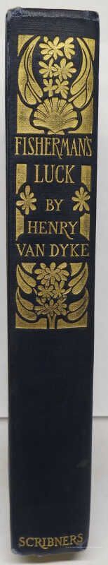 Signed Margaret Armstrong Art Nouveau design of gilt fish swimming in a figure eight. Stamped in gilt, pale blue, and green on navy blue cloth. Gilt title and design to spine. One of a series of uniform bindings designed by Armstrong for Van Dyck titles issued by Scribners.
