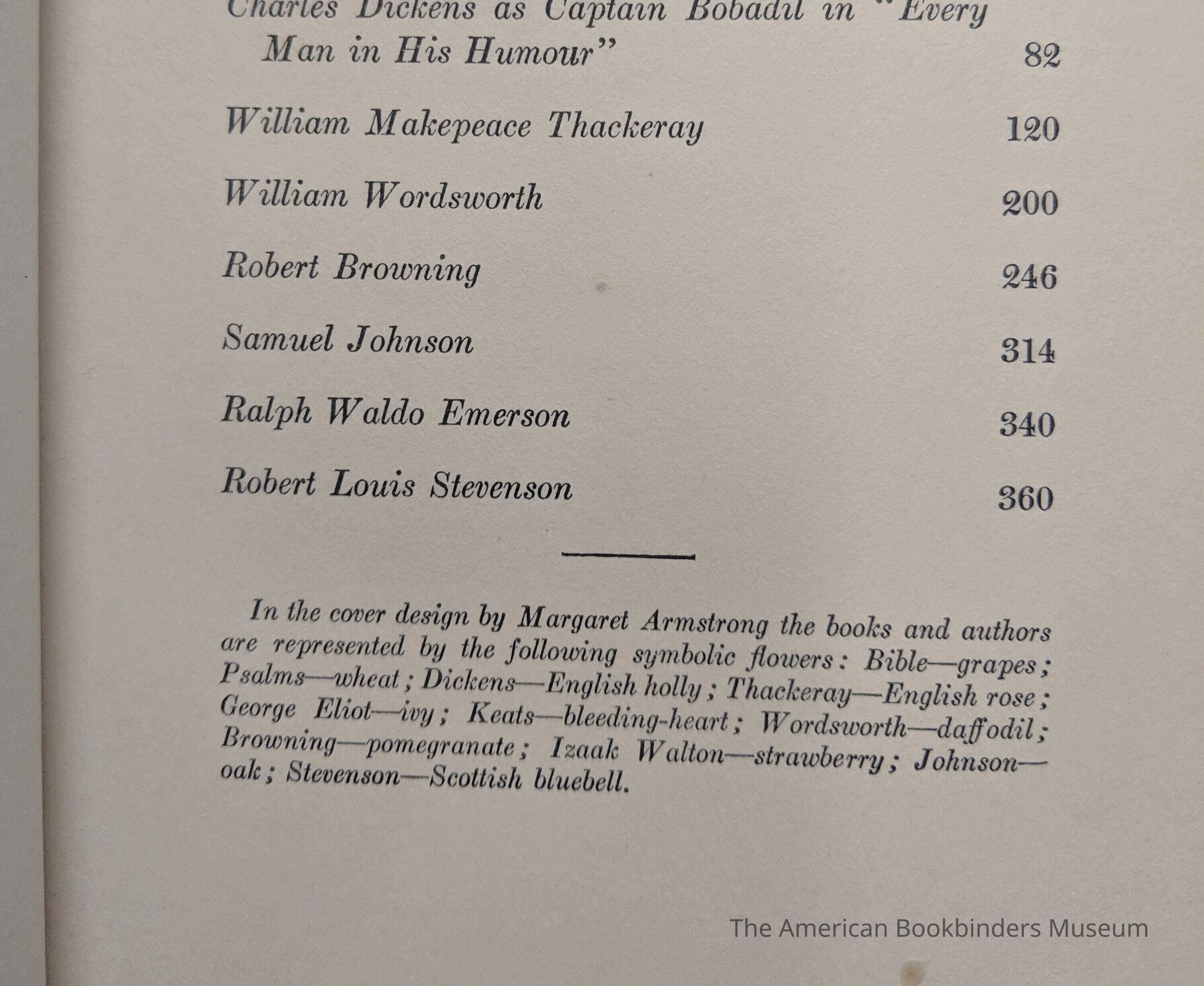 Contents: The Book of books -- Poetry in the Psalms -- The good enchantment of Dickens -- Thackeray and real men -- George Eliot and real women -- The poet of immortal youth (Keats) -- The recovery of joy (Wordsworth) -- "The glory of the imperfect" (Browning) -- A quaint comrade by quiet streams (Walton) -- A sturdy believer (Samuel Johnson) -- A Puritan plus poetry (Emerson) -- An adventurer in a velvet jacket (Stevenson).