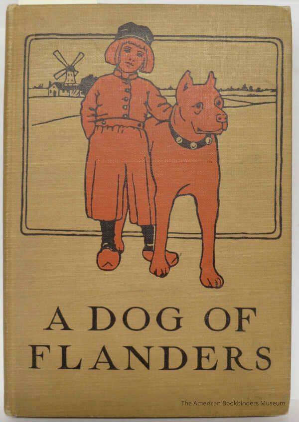 Bound in tan cloth with poster style illustrated cover design of Dutch boy and his large dog, stamped in orange, standing in front of a framed windmill scene, stamped in black. Pictorial orange endpapers.
