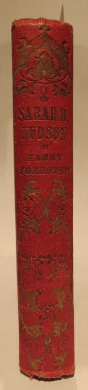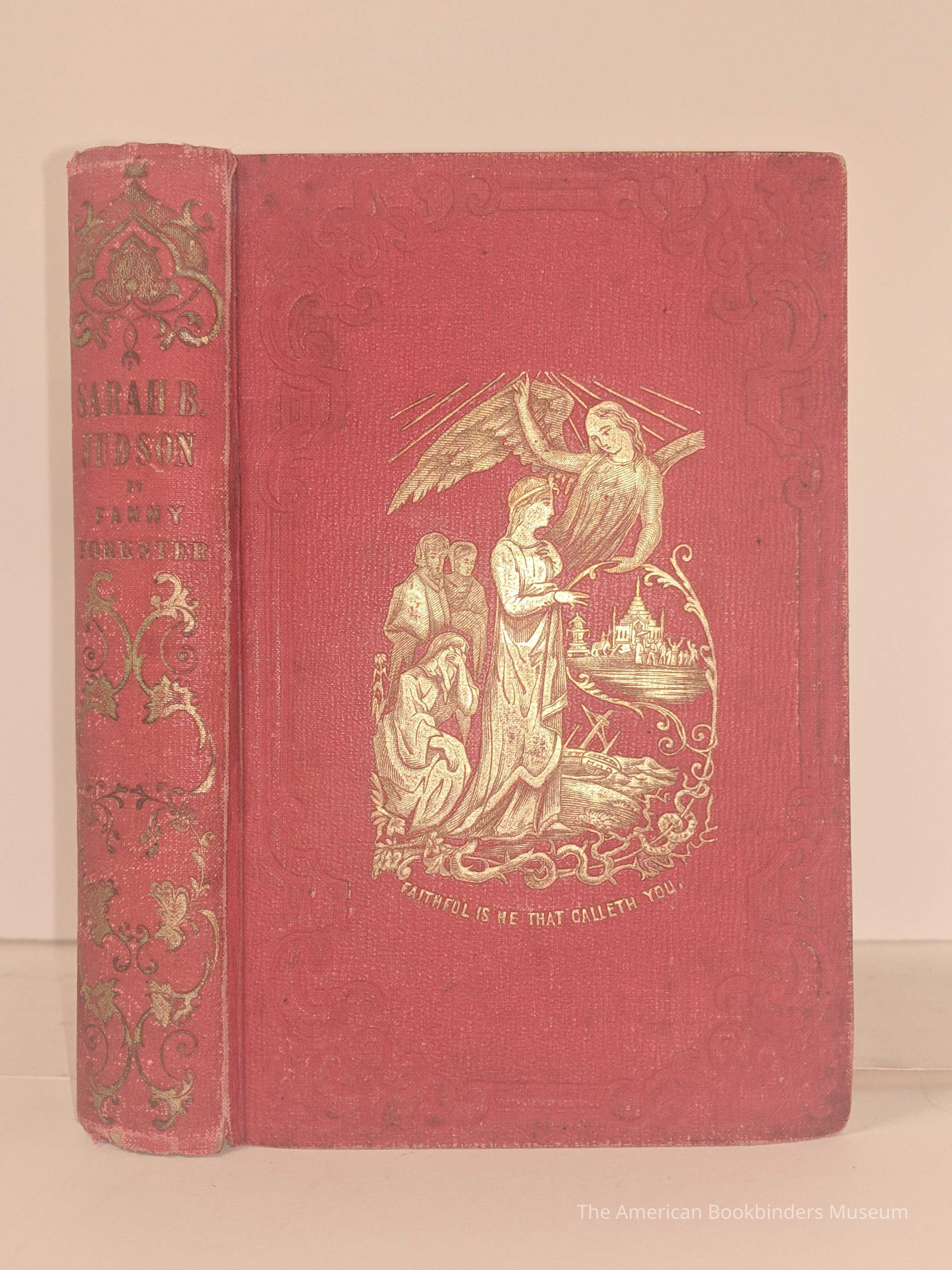 Bound in red cloth with blind stamped borders to front and rear. Central gilt stamped religious scene of angel and mortals with a Burmese view in background with "Faithful is he that calleth you" stamped at the bottom. Spine decoration in gilt. Tissue guarded frontis. "Colton & Jenkins" blind stamped at top and bottom center ribbons of border design. Part of die for the blind stamping.