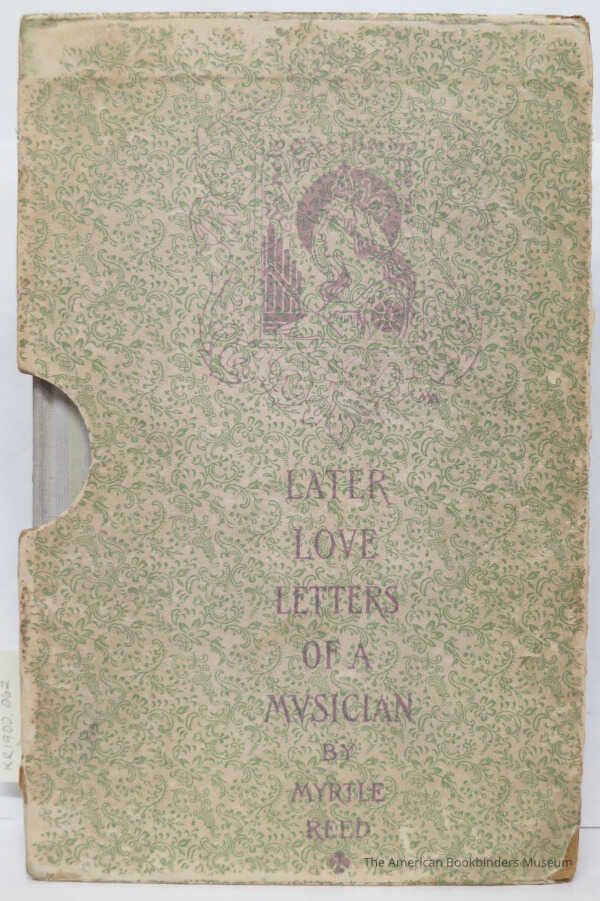 Art nouveau gilt stamped design of woman's portrait in ivory by Margaret Armstrong. Binding signed with the initials "MA" (monogram at bottom right corner of the floral border at center). One of a set of Reed's titles issued at various times by Putnam. Most commonly seen in lavender cloth. This is bound in pale grey cloth with gilt spine decoration and titles. Notable for the iris design created by embossing the ivory cloth and stamping the background a subtle pale green. In original slipcase printed in green floral pattern with replication of cover design, missing spine edge. Top edge gilt. Deckled page edges.